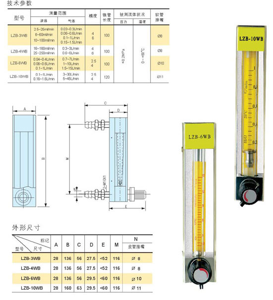 一、概述: LZB-()WB、W型玻璃轉(zhuǎn)子流量計(jì)可以檢測(cè)氣體或液體的小流量,具有小巧的外形,廣泛用于各種分析儀器、環(huán)境保護(hù)設(shè)備、醫(yī)療設(shè)備及其它試驗(yàn)儀器配套。WB型帶有調(diào)節(jié)閥、W型為不帶調(diào)節(jié)閥結(jié)構(gòu)。 二、技術(shù)參數(shù):