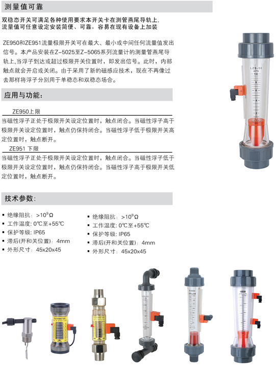 流量報警開關(guān)主要用于Z-5015~Z-5065、Z-600系列水平流量計、10S、20S、K-500、GA245、GA24V等玻璃轉(zhuǎn)子流量計,ZE950上限報警,ZE951下限報警。